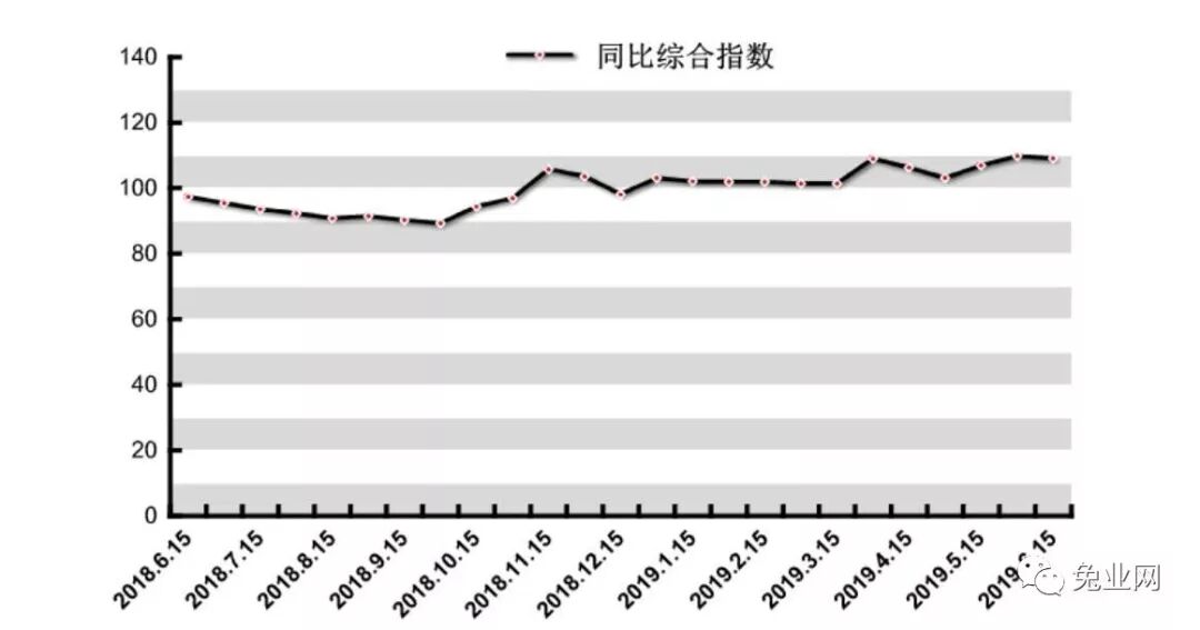 与去年相比(图3),2019年6月1日—15日期间,尚村毛皮市场毛皮同比价格指数收于109.14 点,原料总体价格上涨9.14 %,国产狐皮收于112.44 点,价格上涨12.44 %,国产貂皮收于89.05 点,下降10.95 %,国产貉皮收于112.08 点,上涨12.08 %,獭兔皮收于119.05 点,上涨19.05 %。