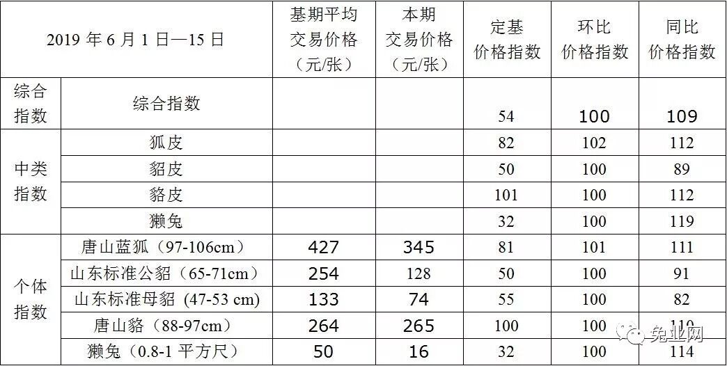 第20190615期中国尚村毛皮交易市场毛皮原料价格和价格指数一览表