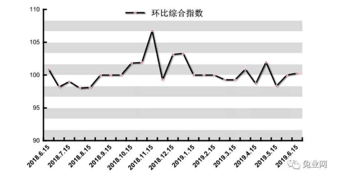 与上一期相比(图4),2019年6月1日—15日期间,尚村毛皮市场毛皮环比价格指数收于100.29 点,原料总体价格上涨0.29 %,国产狐皮收于101.59 点,价格上涨1.59 %,国产貂皮收于100.00 点,无变化,国产貉皮收于100.00 点,无变化,獭兔皮收于100.00 点,无变化。
